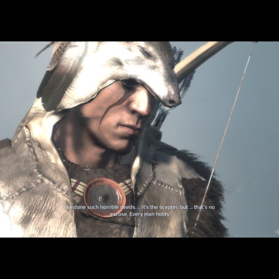 ก่อนจะจบขอสาธยายเกี่ยวกับความสามารถเพิ่มเติมของ ราดูนฮาเกดูนสักหน่อยก่อน ตั้งแต่ DLC บทแรกอย่างที่ทราบคือ พ่อหนุ่มโมฮอว์กของเรา จะมีสามารถใช้ความสามารถของหมาป่าได้ เช่น การพลางตัว (Cloak) และการเรียกหมาป่ามาช่วยเราสู้รบ ในบทที่ 2 นี่ เล่น ๆ ไปตอนแรกนึกว่าหลุดไปอยู่เกมอื่นที่ไม่ใช่ Assassin’s creed อะ คือมันห่างไกลกับความเป็นจริงเข้าไปทุกที ราดูนฮาเกดูนมาแบบเฮ้ย…บรรยายไม่ถูก ประมาณว่า มันแฟนตาซีมาก สามารถใช้ความสามารถของนกอินทรีได้้ด้วย สามารถบินได้!! อันที่จริงความสามารถที่ให้มานี่ก็โอเคนะ มันสะดวกดีเวลาจะเดินทางไปไหนมาไหน บินไปก็เร็วดี พอได้เล่น DLC ชุดนี้ก็เลยตัดความคิดเก่า ๆ ที่ว่าเป็น Assassin ทิ้งไปเลย แล้วก็คิดซะว่าเรากำลังเล่น Prince of Persia อยู่แล้วกัน แต่เปลี่ยนจากเจ้าชายเปอร์เซียเป็น เจ้าชายเผ่าโมฮอว์กแทน