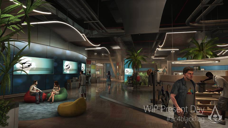 เรื่องราวใน Abstergo Entertainmet มันน่าสนุก ดูทันสมัยและเก๋ไก๋ ลองนึกภาพ Google สิ สมมติว่า Google แท้จริงแล้วกำลังทำอะไรบางอย่างลับ ๆ ตามคำสั่งของบรรพบุรุษในยุคก่อนเพื่อจะสร้างโลกใหม่ที่สมบูรณ์แบบขึ้นมาล่ะมันจะเป็นอย่างไร เมื่อคุณออกจากเครื่อง Animus และเดินท่องเที่ยวไปรอบ ๆ สำนักงาน ที่โต๊ะทำงานของคุณก็จะมีหุ่นจำลองขนาดเล็กตั้งอยู่ (ซึ่งมันจะเป็นการแสดงถึงสถานะในเกมของคุณด้วย) เพื่อนร่วมงานของคุณกำลังเคร่งเครียดอย่างหนักในการทำงานและกำลังพูดคุยกับเพื่อนร่วมงานคนอื่นอยู่