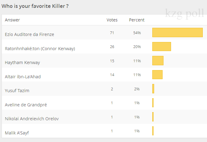 จากการเปิดโหวตเมื่อ 8 เดือนก่อนนะคะ ถึงคราวสรุปผลสักทีว่านักฆ่าในเกม Assassin’s creed ที่เพื่อน ๆ ผู้เข้ามาเยี่ยมชมบล็อก krezeegamer ชื่นชอบมากที่สุดเป็นใคร  ดูผลได้ตามรูปภาพด้านล่างเลยค่ะ
