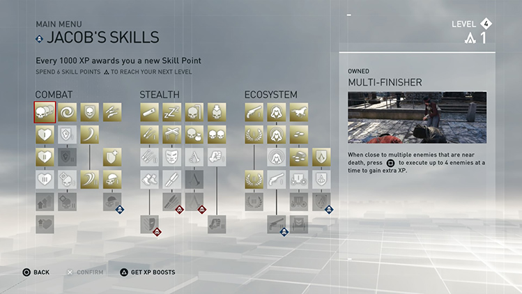 ตอบ Skill Tree จะแบ่งออกเป็น 3 หัวข้อใหญ่ คือ Stealth (ซ่อนพลาง), Combat (การต่อสู้) และ Ecosystem (ทักษะอื่น ๆ) ซึ่ง Stealth และ Combat จะประกอบไปด้วย ทักษะการทำท่าต่อเนื่อง (Combo boost) การสะเดาะกุญแจ และ พลังชีวิต ส่วน Ecosystem จะประกอบไปด้วย Eagle vision , การขับรถม้า เป็นต้น